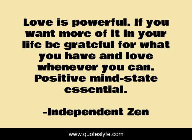 This page presents the quote "Love is powerful. If you want more of it in your life be grateful for what you have and love whenever you can. Positive mind-state essential.". Author of this quote is Independent Zen. This quote is about mindstate, love, independent-zen, affection, gratefulness,.