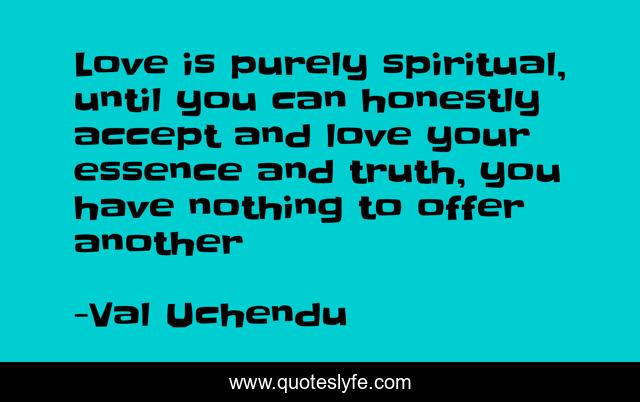 This page presents the quote "Love is purely spiritual, until you can honestly accept and love your essence and truth, you have nothing to offer another". Author of this quote is Val Uchendu. This quote is about spiritual, acceptance, love, truth, affection,.