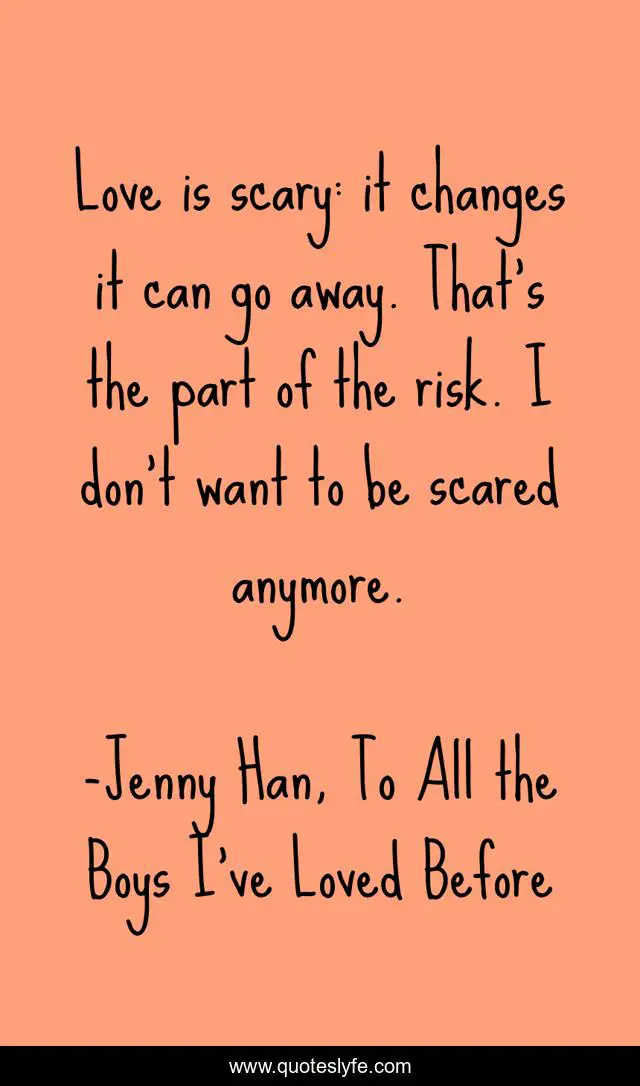 This page presents the quote "Love is scary: it changes it can go away. That's the part of the risk. I don't want to be scared anymore.". Author of this quote is Jenny Han, To All the Boys I've Loved Before. This quote is about take-the-risk, be-brave, love, embrace-change, affection,.