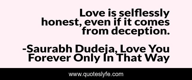 This page presents the quote "Love is selflessly honest, even if it comes from deception.". Author of this quote is Saurabh Dudeja, Love You Forever Only In That Way. This quote is about saurabh-dudeja, love, forever, love-you-forever, affection,.