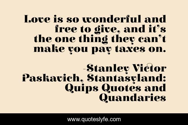 This page presents the quote "Love is so wonderful and free to give, and it’s the one thing they can’t make you pay taxes on.". Author of this quote is Stanley Victor Paskavich, Stantasyland: Quips Quotes and Quandaries. This quote is about compassion, love, affection,.