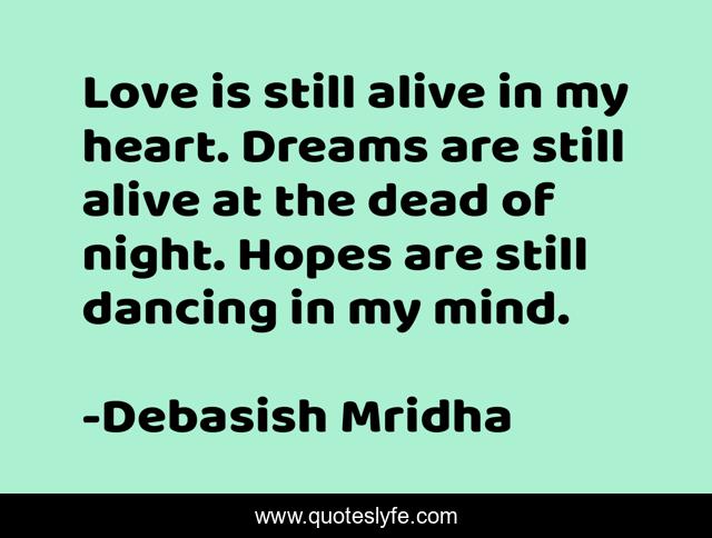 This page presents the quote "Love is still alive in my heart. Dreams are still alive at the dead of night. Hopes are still dancing in my mind.". Author of this quote is Debasish Mridha. This quote is about life, love, knowledge, inspirational, intelligence, philosophy, wisdom, affection, truth,.
