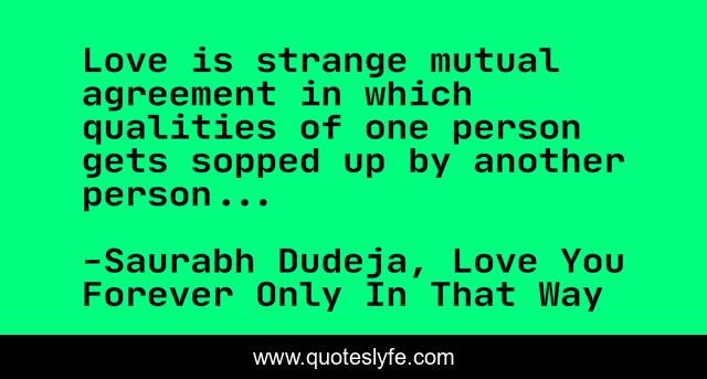This page presents the quote "Love is strange mutual agreement in which qualities of one person gets sopped up by another person...". Author of this quote is Saurabh Dudeja, Love You Forever Only In That Way. This quote is about saurabh-dudeja, love, forever, love-you-forever, affection,.