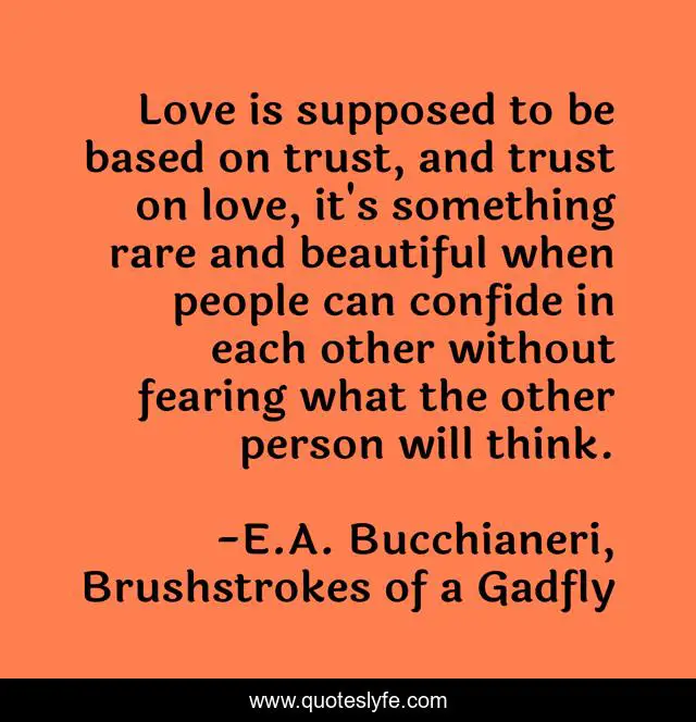 This page presents the quote "Love is supposed to be based on trust, and trust on love, it's something rare and beautiful when people can confide in each other without fearing what the other person will think.". Author of this quote is E.A. Bucchianeri, Brushstrokes of a Gadfly. This quote is about caring, relationships, confidence, love, soul-mates, beauty, i-love-you-always, i-love-you-forever, fearless,.