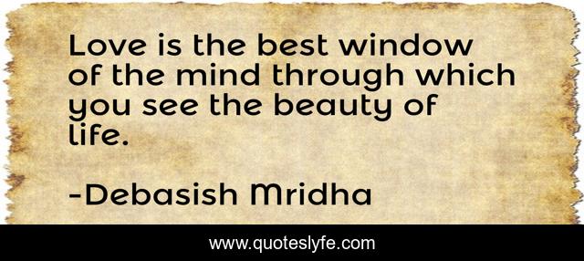 This page presents the quote "Love is the best window of the mind through which you see the beauty of life.". Author of this quote is Debasish Mridha. This quote is about debasish, love, mind, philosophy, debasish-mridha, love-is-the-best-window, mridha, beauty-of-life, affection,.