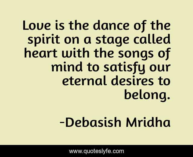 This page presents the quote "Love is the dance of the spirit on a stage called heart with the songs of mind to satisfy our eternal desires to belong.". Author of this quote is Debasish Mridha. This quote is about life, love, knowledge, inspirational, intelligence, philosophy, wisdom, quotes, affection,.