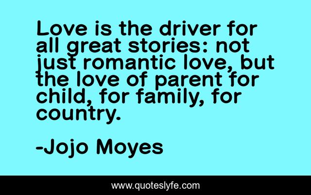 This page presents the quote "Love is the driver for all great stories: not just romantic love, but the love of parent for child, for family, for country.". Author of this quote is Jojo Moyes. This quote is about great, love, family, affection,.