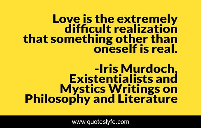 This page presents the quote "Love is the extremely difficult realization that something other than oneself is real.". Author of this quote is Iris Murdoch, Existentialists and Mystics Writings on Philosophy and Literature. This quote is about love, affection, realization,.