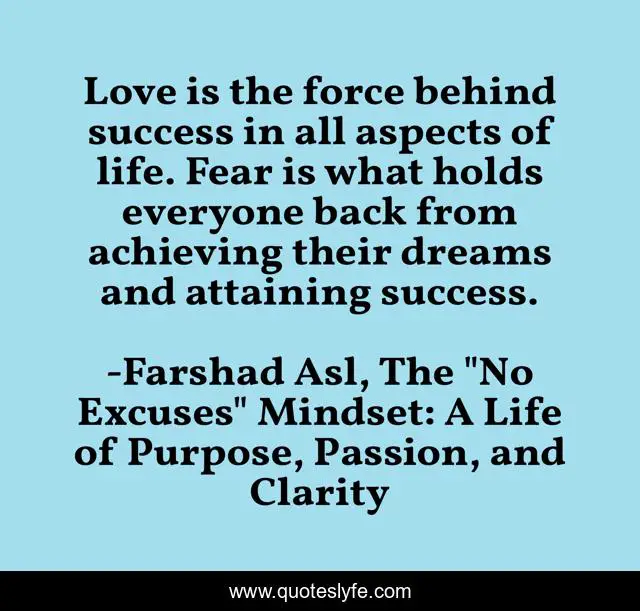 This page presents the quote "Love is the force behind success in all aspects of life. Fear is what holds everyone back from achieving their dreams and attaining success.". Author of this quote is Farshad Asl, The "No Excuses" Mindset: A Life of Purpose, Passion, and Clarity. This quote is about succcess, fear, love, affection,.