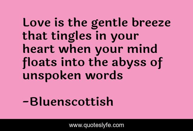 This page presents the quote "Love is the gentle breeze that tingles in your heart when your mind floats into the abyss of unspoken words". Author of this quote is Bluenscottish. This quote is about abyss, love, bluenscottish, love-and-sayings, affection,.