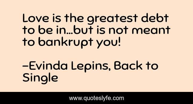 This page presents the quote "Love is the greatest debt to be in…but is not meant to bankrupt you!". Author of this quote is Evinda Lepins, Back to Single. This quote is about relationships, love, affection,.
