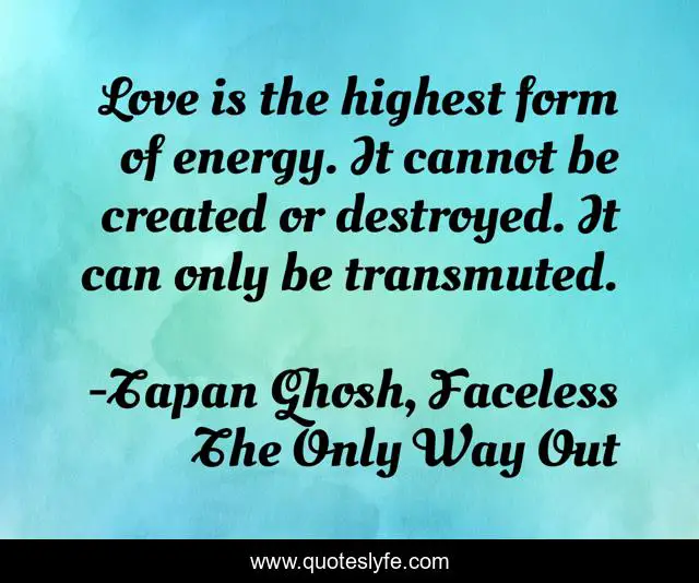 This page presents the quote "Love is the highest form of energy. It cannot be created or destroyed. It can only be transmuted.". Author of this quote is Tapan Ghosh, Faceless The Only Way Out. This quote is about love, affection,.