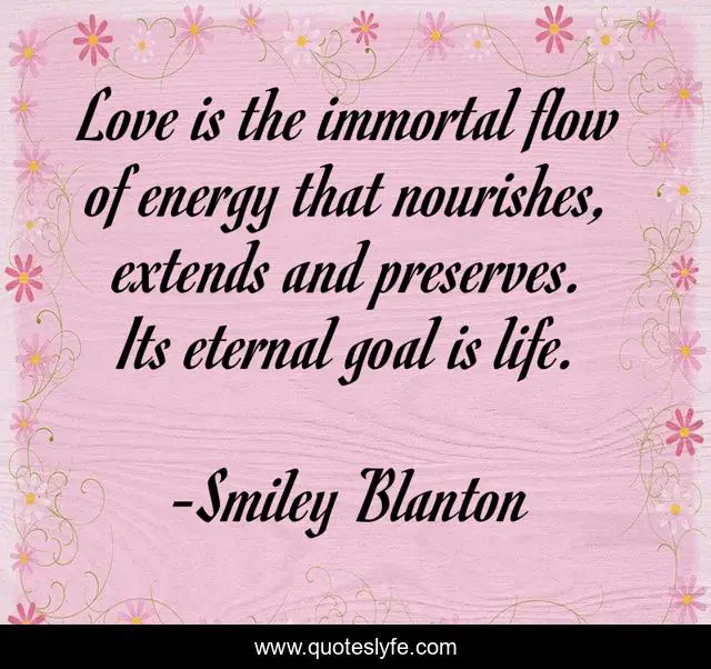 This page presents the quote "Love is the immortal flow of energy that nourishes, extends and preserves. Its eternal goal is life.". Author of this quote is Smiley Blanton. This quote is about energy, love, life, affection,.