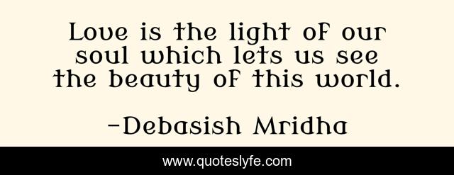 This page presents the quote "Love is the light of our soul which lets us see the beauty of this world.". Author of this quote is Debasish Mridha. This quote is about debasish, love, light, philosophy, debasish-mridha, soul, beauty-of-this-world, lets-us-see-the-beauty, mridha,.