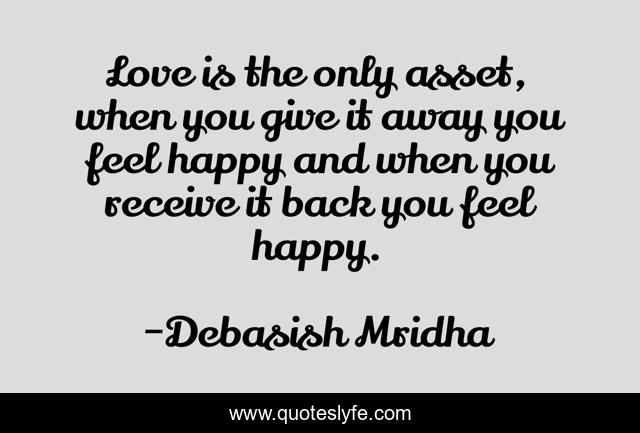 This page presents the quote "Love is the only asset, when you give it away you feel happy and when you receive it back you feel happy.". Author of this quote is Debasish Mridha. This quote is about life, love, knowledge, inspirational, intelligence, philosophy, wisdom, quotes, affection,.