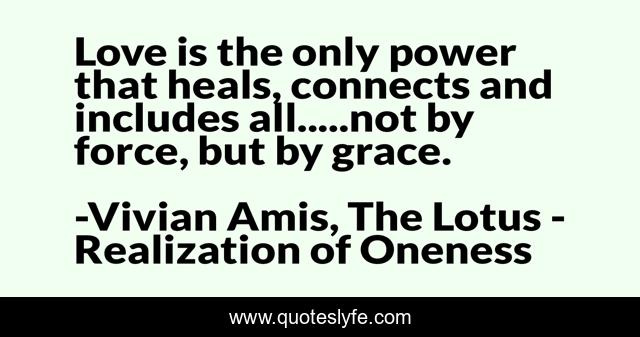 This page presents the quote "Love is the only power that heals, connects and includes all.....not by force, but by grace.". Author of this quote is Vivian Amis, The Lotus - Realization of Oneness. This quote is about enlightenment, confidence, helplessness, love, wealth, solutions, positive, motivational, problems,.