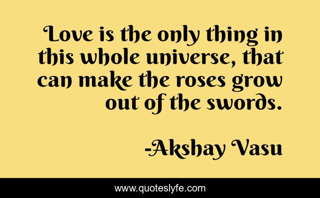 This page presents the quote "Love is the only thing in this whole universe, that can make the roses grow out of the swords.". Author of this quote is Akshay Vasu. This quote is about love, universe, reality, roses, only, sword, grow, affection,.