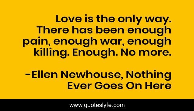 This page presents the quote "Love is the only way. There has been enough pain, enough war, enough killing. Enough. No more.". Author of this quote is Ellen Newhouse, Nothing Ever Goes On Here. This quote is about love, pain, healing, affection, war,.