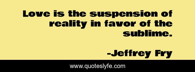This page presents the quote "Love is the suspension of reality in favor of the sublime.". Author of this quote is Jeffrey Fry. This quote is about love, reality, favor, sublime, suspension, affection,.