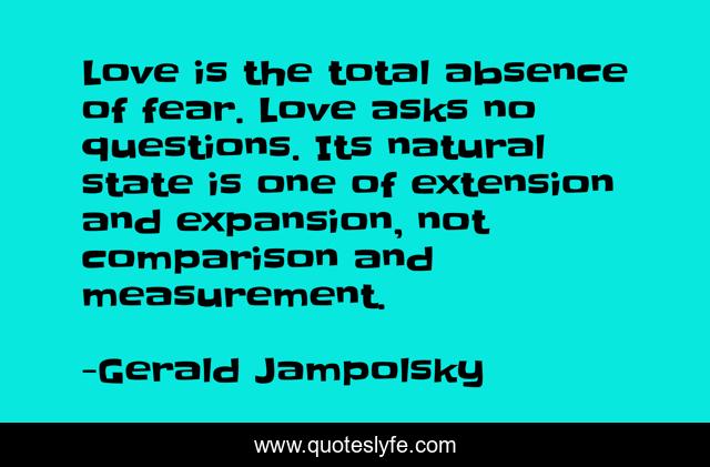 This page presents the quote "Love is the total absence of fear. Love asks no questions. Its natural state is one of extension and expansion, not comparison and measurement.". Author of this quote is Gerald Jampolsky. This quote is about love, questions, affection, love is,.