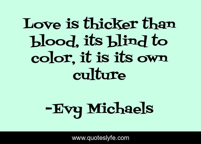 This page presents the quote "Love is thicker than blood, its blind to color, it is its own culture". Author of this quote is Evy Michaels. This quote is about color, culture, love, affection,.