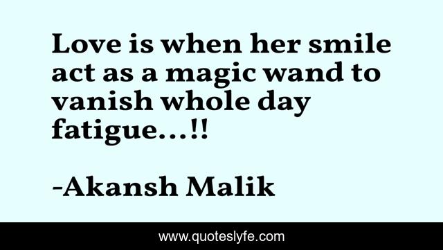 This page presents the quote "Love is when her smile act as a magic wand to vanish whole day fatigue...!!". Author of this quote is Akansh Malik. This quote is about love, magic, affection, happiness, smile,.