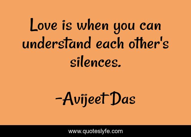 This page presents the quote "Love is when you can understand each other's silences.". Author of this quote is Avijeet Das. This quote is about silence, love-is-beautiful, love, love-and-sayings, understanding, silences-speak-more-than-words, love-is-all-you-need, meaning-of-life-is-relationships, meaning-of-love,.