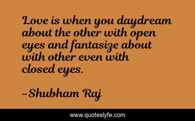 This page presents the quote "Love is when you daydream about the other with open eyes and fantasize about with other even with closed eyes.". Author of this quote is Shubham Raj. This quote is about eyes, lovers, love, day-dream, couples, fantasize, affection,.