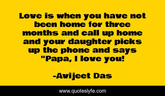 This page presents the quote "Love is when you have not been home for three months and call up home and your daughter picks up the phone and says "Papa, I love you!". Author of this quote is Avijeet Das. This quote is about love, meaning-of-life-is-each-other, meaning-of-life-is-relationships, telephone, calling-people, call, home, daughter, family-love,.