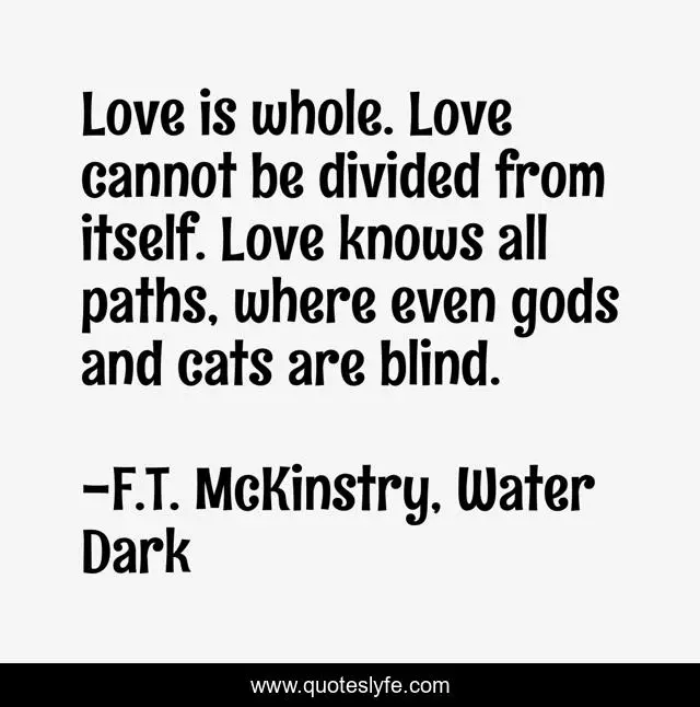 This page presents the quote "Love is whole. Love cannot be divided from itself. Love knows all paths, where even gods and cats are blind.". Author of this quote is F.T. McKinstry, Water Dark. This quote is about fantasy, cats, love, affection, gods,.