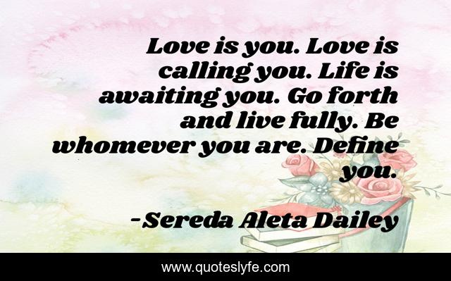 This page presents the quote "Love is you. Love is calling you. Life is awaiting you. Go forth and live fully. Be whomever you are. Define you.". Author of this quote is Sereda Aleta Dailey. This quote is about personal-development, self-love, spiritual-lessons, life-lessons,.