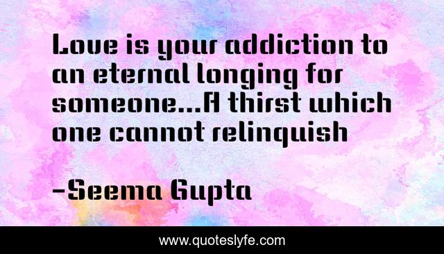 This page presents the quote "Love is your addiction to an eternal longing for someone...A thirst which one cannot relinquish". Author of this quote is Seema Gupta. This quote is about broken-heart, life, lonely, love, divine-love, heartbreak, passion, deep-love, inspirational,.