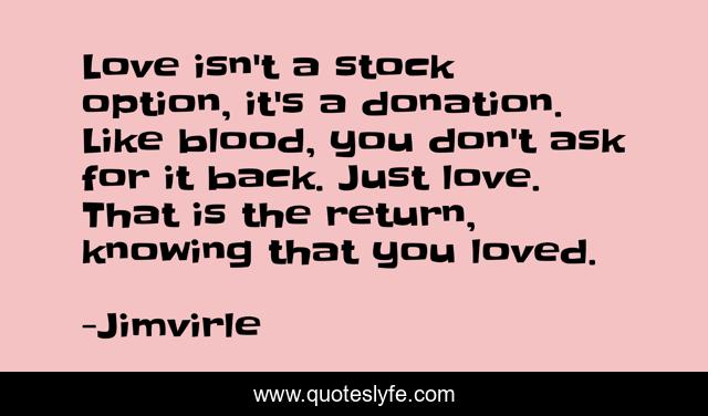 This page presents the quote "Love isn't a stock option, it's a donation. Like blood, you don't ask for it back. Just love. That is the return, knowing that you loved.". Author of this quote is Jimvirle. This quote is about donation, love, blood, affection,.