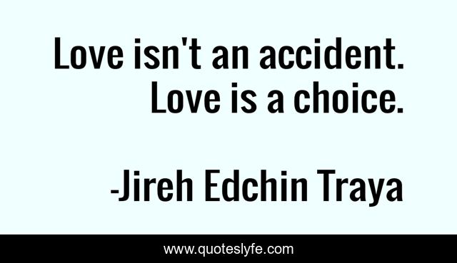 This page presents the quote "Love isn't an accident. Love is a choice.". Author of this quote is Jireh Edchin Traya. This quote is about love, affection, choice,.