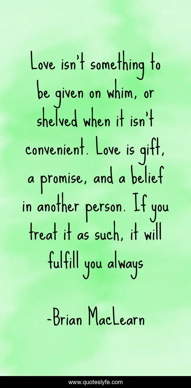 This page presents the quote "Love isn't something to be given on whim, or shelved when it isn't convenient. Love is gift, a promise, and a belief in another person. If you treat it as such, it will fulfill you always". Author of this quote is Brian MacLearn. This quote is about love, passion, life-lessons, affection,.