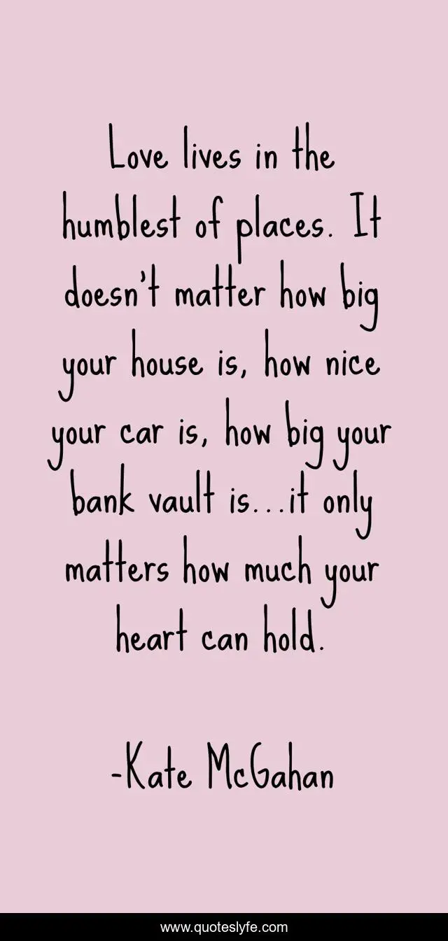 This page presents the quote "Love lives in the humblest of places. It doesn't matter how big your house is, how nice your car is, how big your bank vault is...it only matters how much your heart can hold.". Author of this quote is Kate McGahan. This quote is about heart, love, wealth, house, riches, bank, car, affection,.