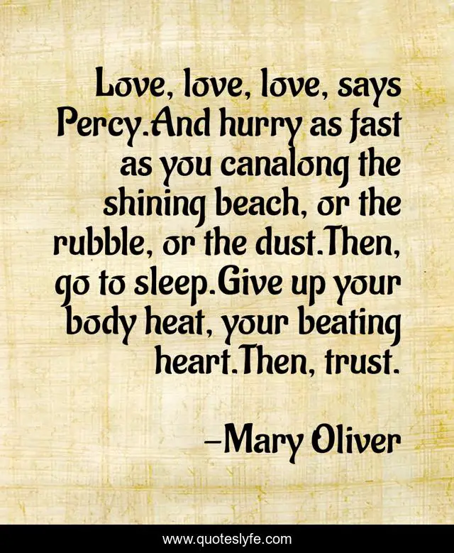 This page presents the quote "Love, love, love, says Percy.And hurry as fast as you canalong the shining beach, or the rubble, or the dust.Then, go to sleep.Give up your body heat, your beating heart.Then, trust.". Author of this quote is Mary Oliver. .