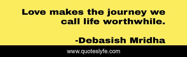 This page presents the quote "Love makes the journey we call life worthwhile.". Author of this quote is Debasish Mridha. This quote is about philosophy, love, makes-life-worthwhile, debasish-mridha, quotes, journey-of-life, inspirational, enthusiasm, debasish-mridha-m-d,.