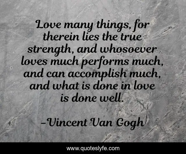 This page presents the quote "Love many things, for therein lies the true strength, and whosoever loves much performs much, and can accomplish much, and what is done in love is done well.". Author of this quote is Vincent Van Gogh. This quote is about strength, true, love is,.