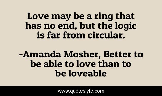 This page presents the quote "Love may be a ring that has no end, but the logic is far from circular.". Author of this quote is Amanda Mosher, Better to be able to love than to be loveable. This quote is about eternity, life, love, love-and-sayings, circular-logic, logic, ring, affection,.
