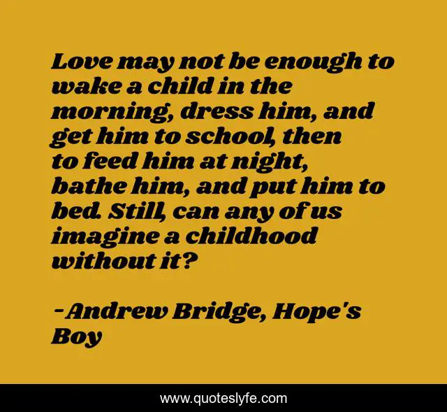 This page presents the quote "Love may not be enough to wake a child in the morning, dress him, and get him to school, then to feed him at night, bathe him, and put him to bed. Still, can any of us imagine a childhood without it?". Author of this quote is Andrew Bridge, Hope's Boy. This quote is about childhood, love-story, inspiration,.