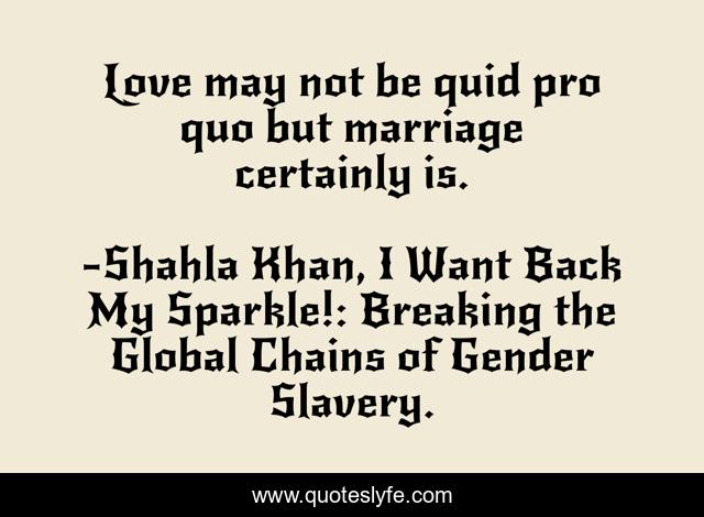This page presents the quote "Love may not be quid pro quo but marriage certainly is.". Author of this quote is Shahla Khan, I Want Back My Sparkle!: Breaking the Global Chains of Gender Slavery.. This quote is about love, violence-against-women, marraige, relationship, affection,.