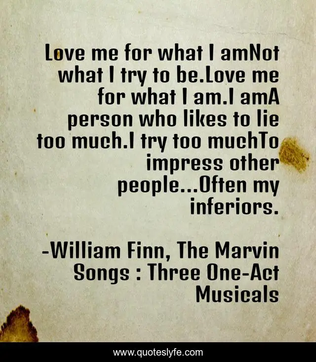 This page presents the quote "Love me for what I amNot what I try to be.Love me for what I am.I amA person who likes to lie too much.I try too muchTo impress other people...Often my inferiors.". Author of this quote is William Finn, The Marvin Songs : Three One-Act Musicals. This quote is about lying, acceptance, love, truth, affection,.