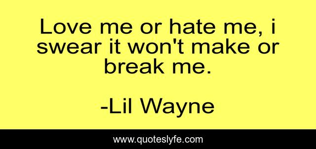 This page presents the quote "Love me or hate me, i swear it won't make or break me.". Author of this quote is Lil Wayne. This quote is about enthusiasm, self-esteem, inspirational, song-lyrics,.