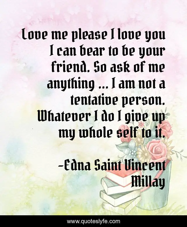 This page presents the quote "Love me please I love you I can bear to be your friend. So ask of me anything ... I am not a tentative person. Whatever I do I give up my whole self to it.". Author of this quote is Edna Saint Vincent Millay. .