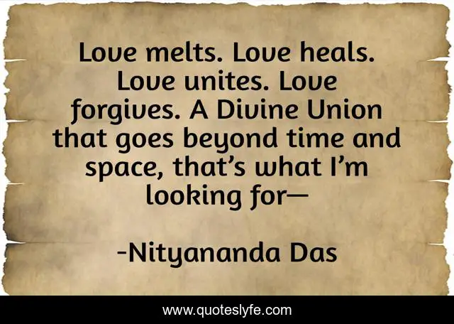 This page presents the quote "Love melts. Love heals. Love unites. Love forgives. A Divine Union that goes beyond time and space, that’s what I’m looking for—". Author of this quote is Nityananda Das. This quote is about forgiveness, divine-union, love, healing, affection,.