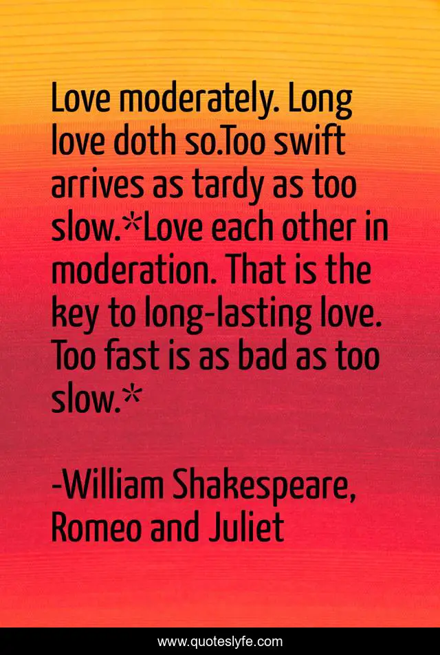 Love moderately. Long love doth so.Too swift arrives as tardy as too slow.*Love each other in moderation. That is the key to long-lasting love. Too fast is as bad as too slow.*
