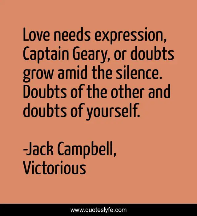 This page presents the quote "Love needs expression, Captain Geary, or doubts grow amid the silence. Doubts of the other and doubts of yourself.". Author of this quote is Jack Campbell, Victorious. This quote is about love, silence, affection, doubts,.