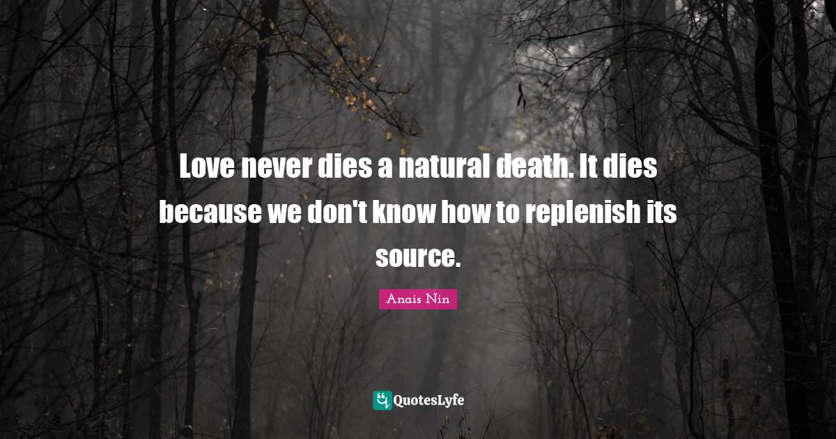"Anais Nin Quotes." Quoteslyfe.com, 2026. Wed. 14 Jan. 2026. <https://www.quoteslyfe.com/quote/Love-never-dies-a-natural-death-It-365945>.