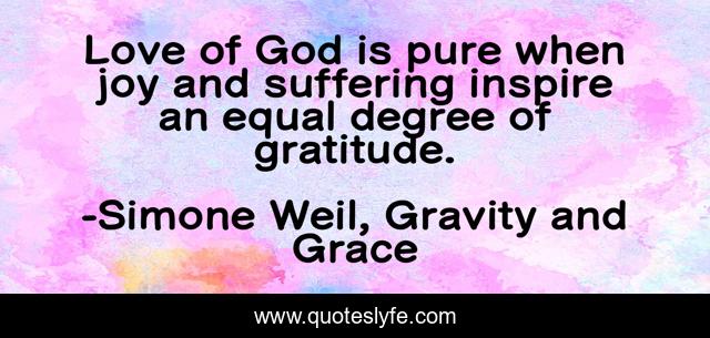 This page presents the quote "Love of God is pure when joy and suffering inspire an equal degree of gratitude.". Author of this quote is Simone Weil, Gravity and Grace. This quote is about gratitude, suffering, love, affection,.